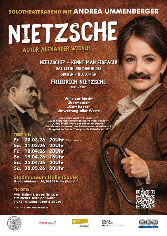 Die Schauspielerin Andrea Ummenberger bringt derzeit in Halle Nietzsche mit einem Solotheaterstück auf die Bühne. In einem fesselnden Theaterabend kann das Publikum den Denker so erleben wie er, zumindest in der Interpretation des österreichischen Schriftstellers Alexander Widner, womöglich während seiner letzten Jahre war: Nicht unbedingt geistig umnachtet, sondern eher wahnsinnig und im Dauerkonflikt mit seiner Schwester, seiner Mutter – und nicht zuletzt seinem Heimatland. Ein selbsterklärter Narr, der gegen die engen Fesseln der deutschen Kleingeistigkeit rebelliert und vom Süden und einer befreiten Sinnlichkeit träumt. Ummenberger zeigt uns so einen Nietzsche, der uns noch heute etwas zu sagen hat; keinen genialischen Heroen, sondern eher einen Antihelden, der aber wichtige Fragen stellt.